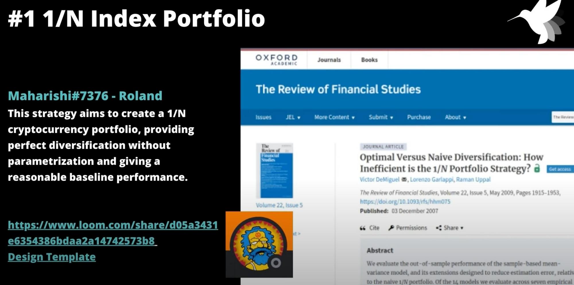 Roland wrote a script that creates a self-rebalancing portfolio based on a 1/N strategy, ensuring ideal diversification without the need for specific parameters, thus offering a satisfactory baseline performance.