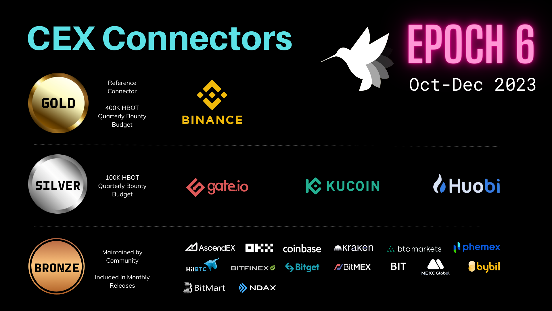 The #2, #3, and #4 vote-getting CEX connectors are each awarded a 100K HBOT bounty budget, which we will use to fund, bug, improvement, and content bounties that allow the community to help maintain and upgrade these connectors over the next quarter.