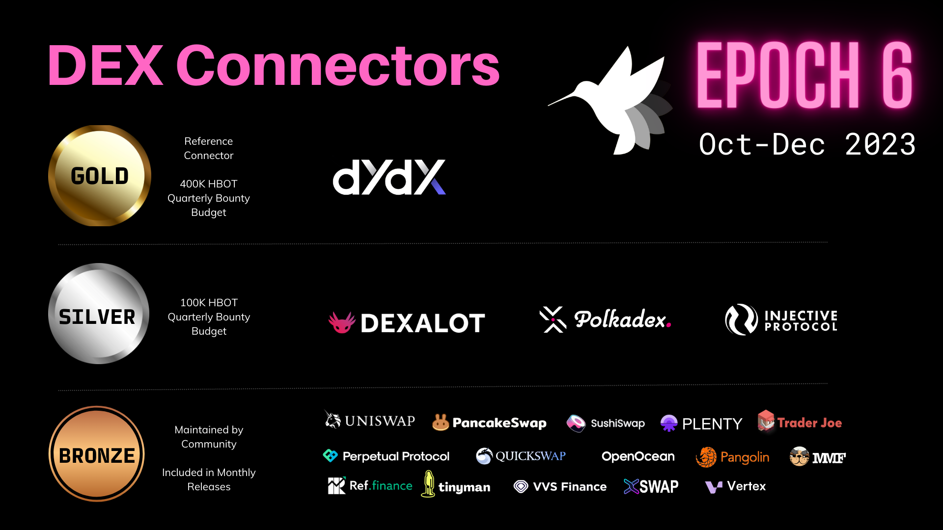 The #2, #3, and #4 vote-getting DEX connectors are each awarded a 100K HBOT bounty budget, which we will use to fund, bug, improvement, and content bounties that allow the community to help maintain and upgrade these connectors over the next quarter.