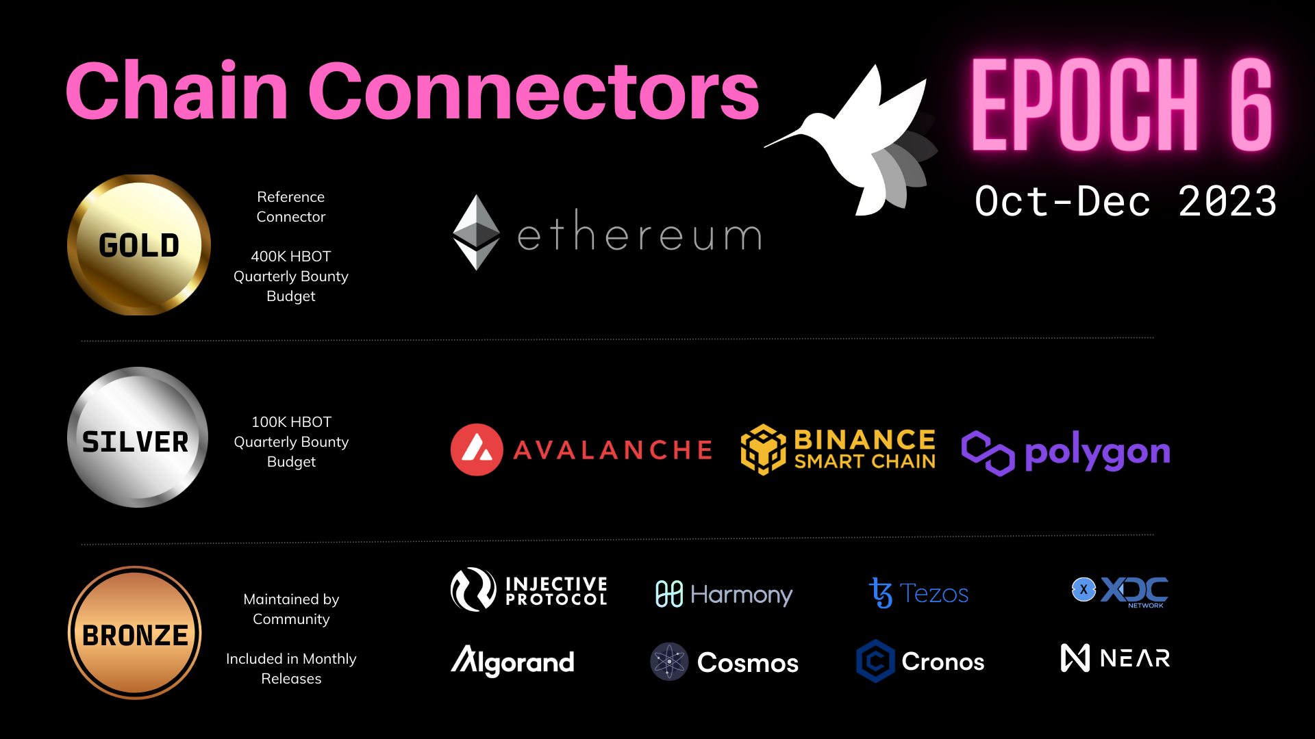 The #2, #3, and #4 vote-getting Chain connectors are each awarded a 100K HBOT bounty budget, which we will use to fund, bug, improvement, and content bounties that allow the community to help maintain and upgrade these connectors over the next quarter.
