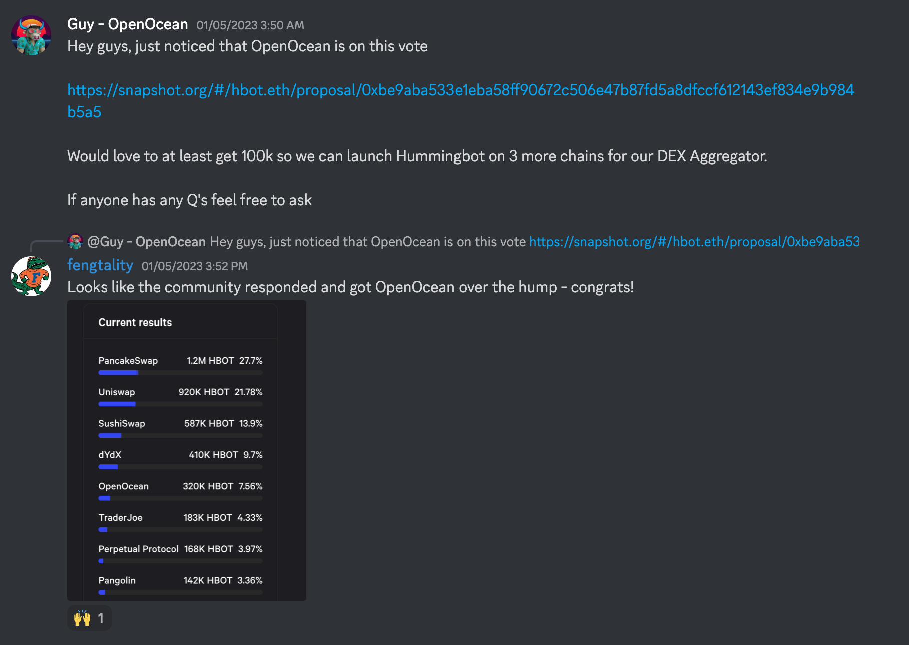 - Campaign for your exchange on Discord: Join our Discord and post and engage with the community, where members can post comments and engage in discussions about the poll topic. One example of an exchange that was successful in doing this was OpenOcean in the Epoch 1 poll.