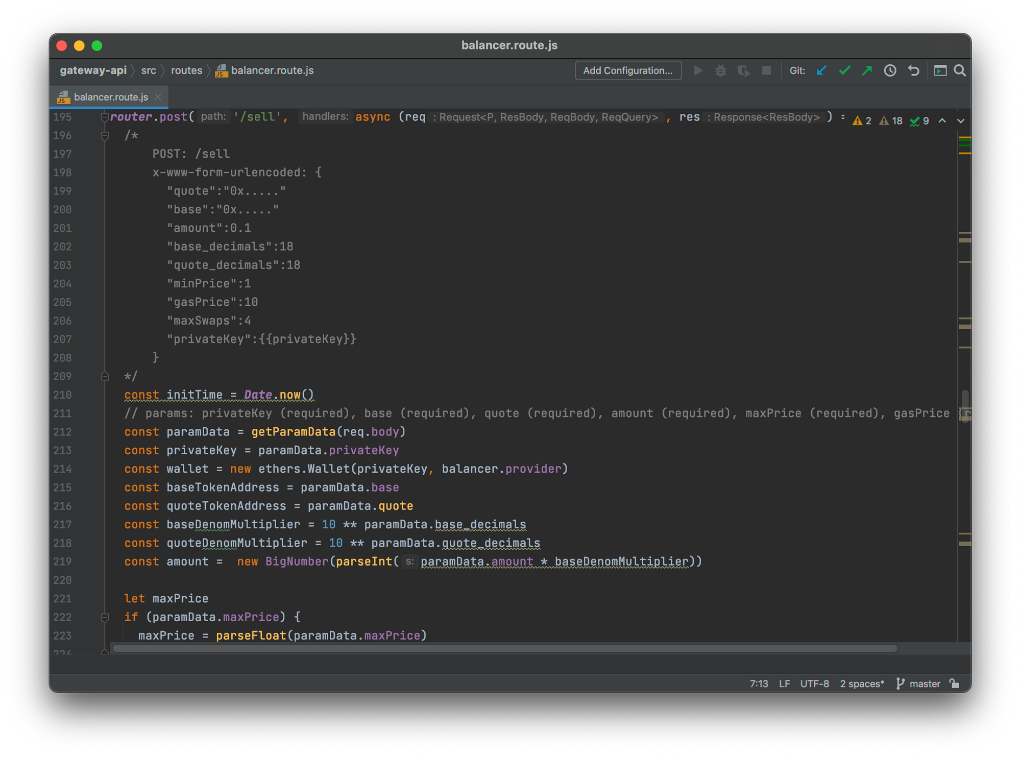 The Gateway API source code can be found in our gateway-api repository (https://github.com/hummingbot/gateway). For example, here is how the balancer/sell API endpoint is implemented on the Gateway API side.