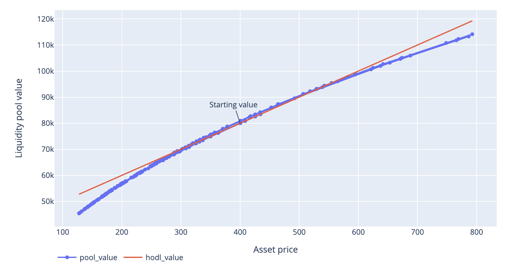 When prices go up, many liquidity providers may be happy their portfolio value increased, and they may not realize or focus on the fact that actually the value of their assets would be even higher had they not done anything. If asset price goes down, well… just blame it on the market. Doing something versus not doing something just gets lost in the broader move in the market! Also, some liquidity providers may just trust that the 0.3% is enough compensation and better than “doing nothing”, but in reality as already mentioned, the 0.3% protocol fee is likely insufficient to compensate liquidity providers for just about any asset with any price volatility (i.e. any asset other than a stable coin).