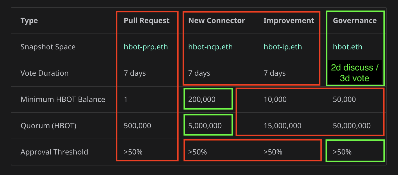 Currently, HBOT holders must navigate four different proposal types, each with their own Snapshot space, quorum requirements, and minimum balance thresholds: