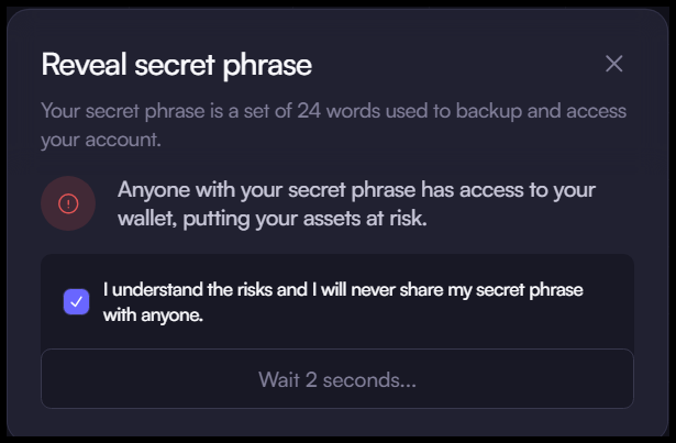 Once available, copy the secret phrase and store it safely in a secure location. You will need this phrase later to connect to Hummingbot.