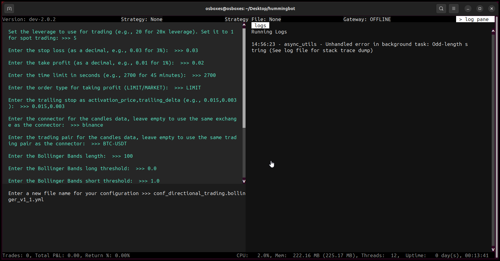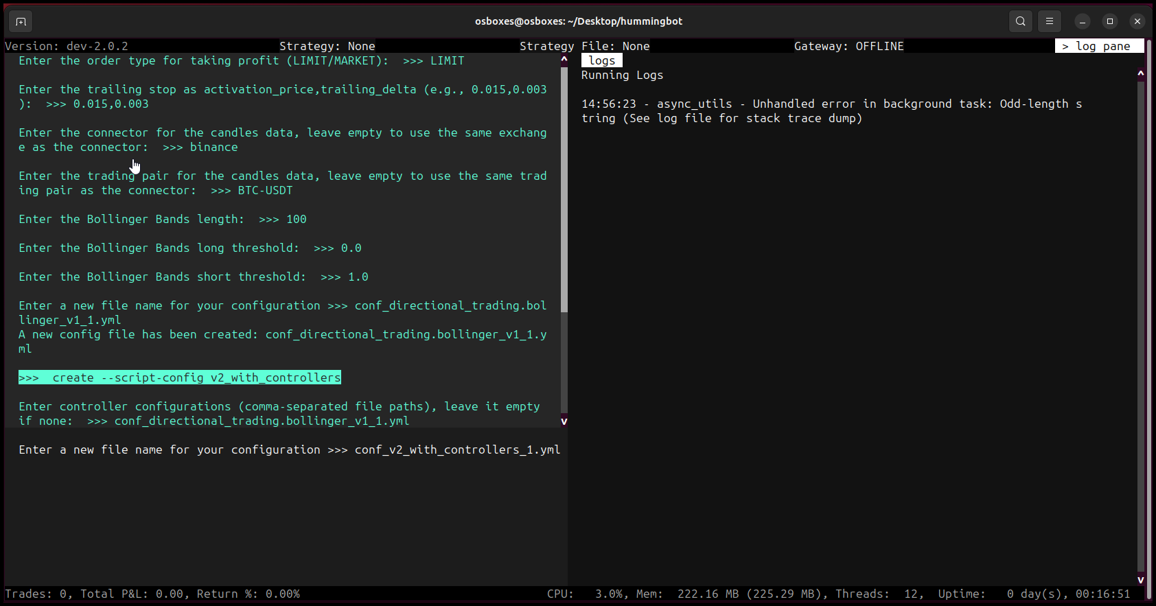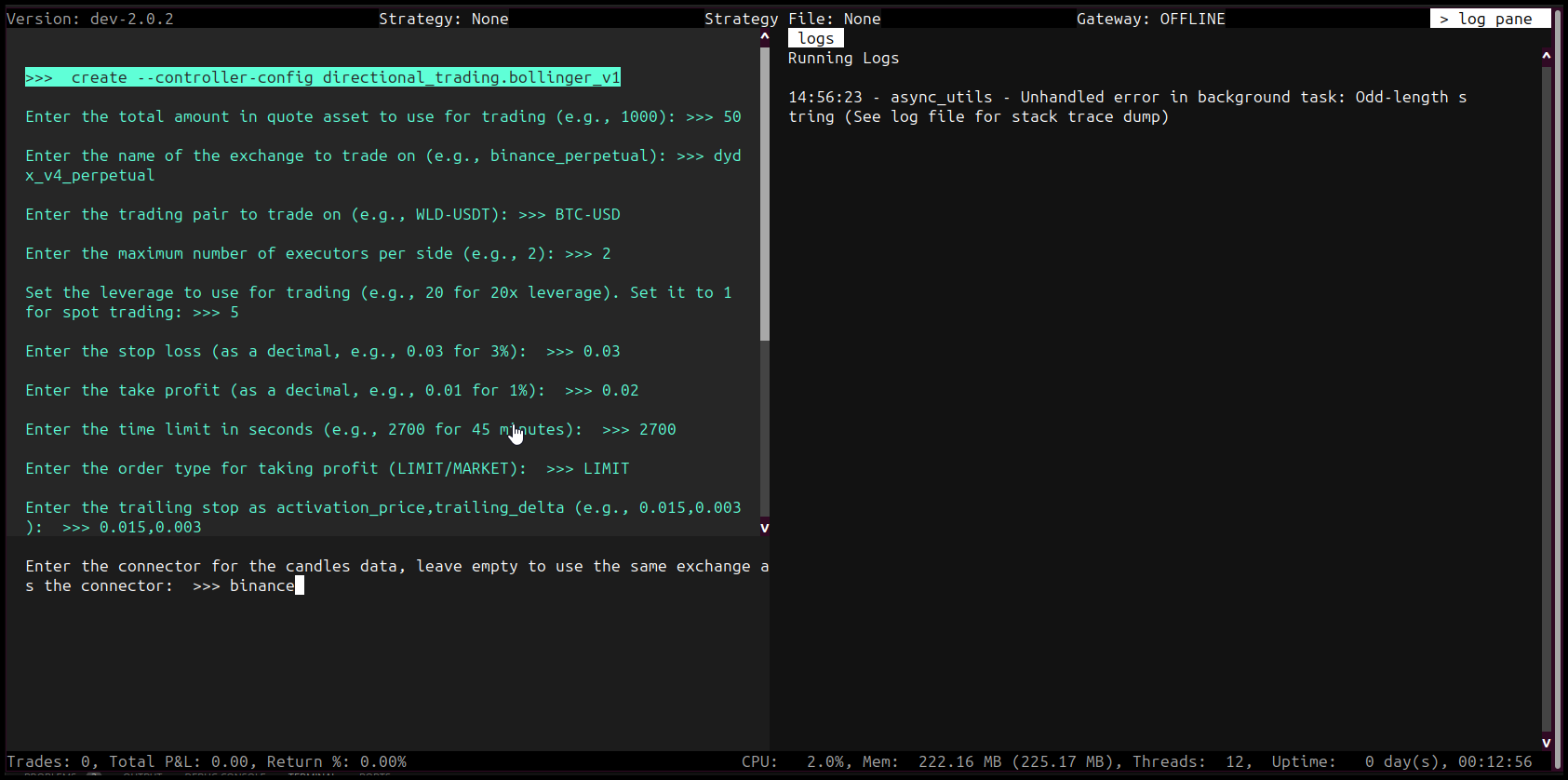 - When prompted for the connector with the candles data, make sure to select a different connector other than dYdX since it doesn't currently support candles feed.
