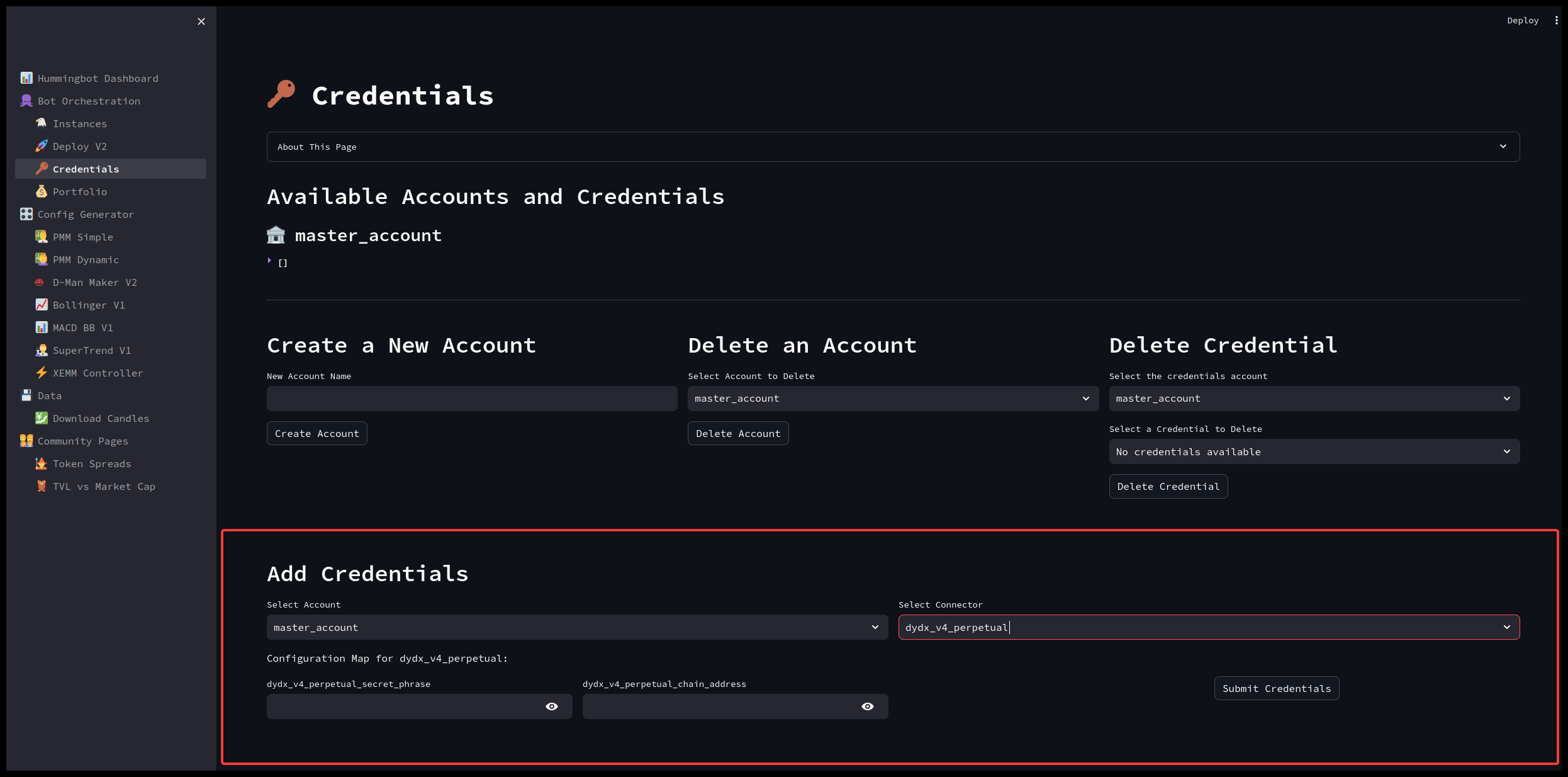 master_account) where you'd like to add the API keys. - From the "Select Connector" dropdown, select dydx_v4_perpetual.