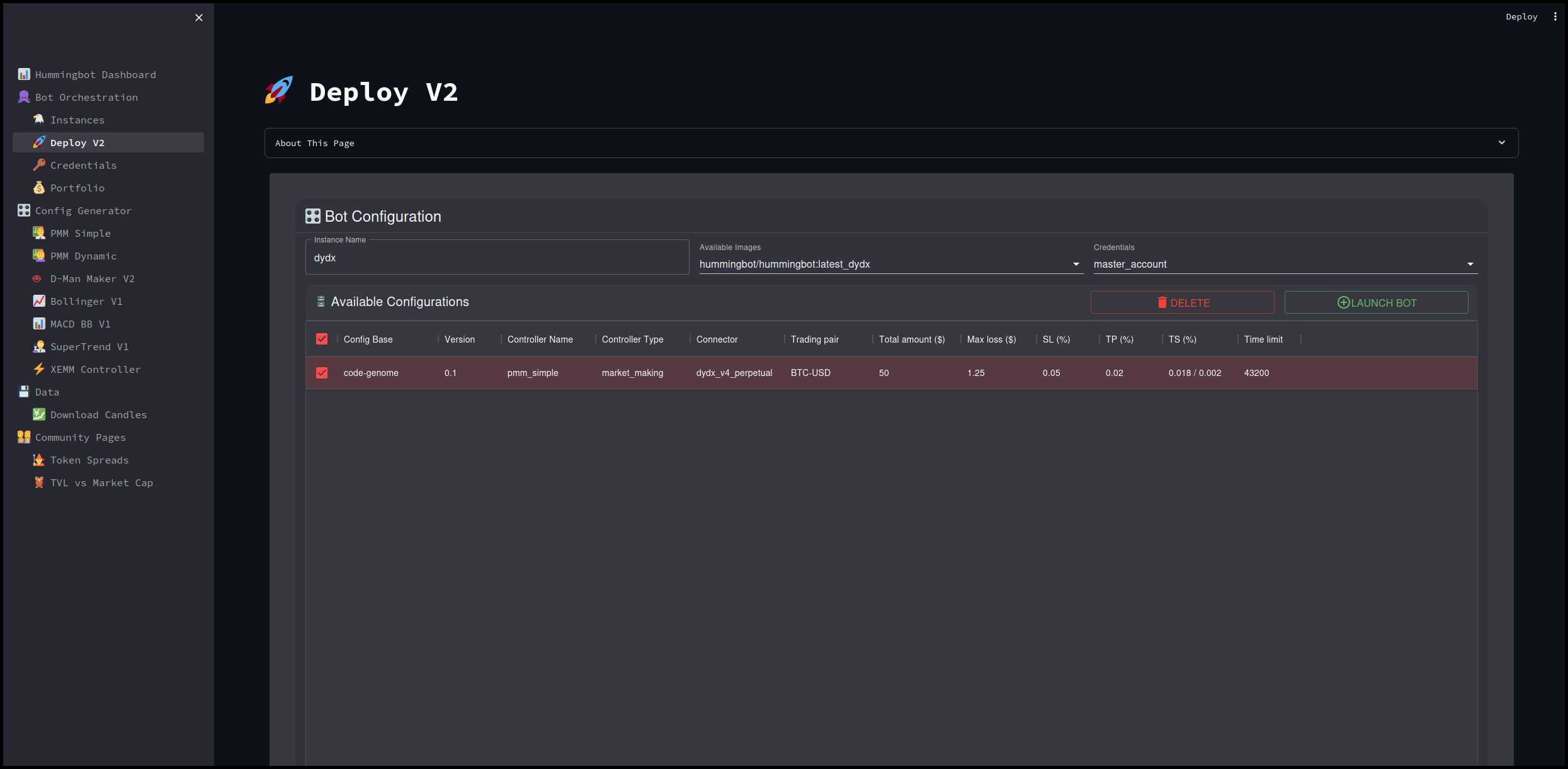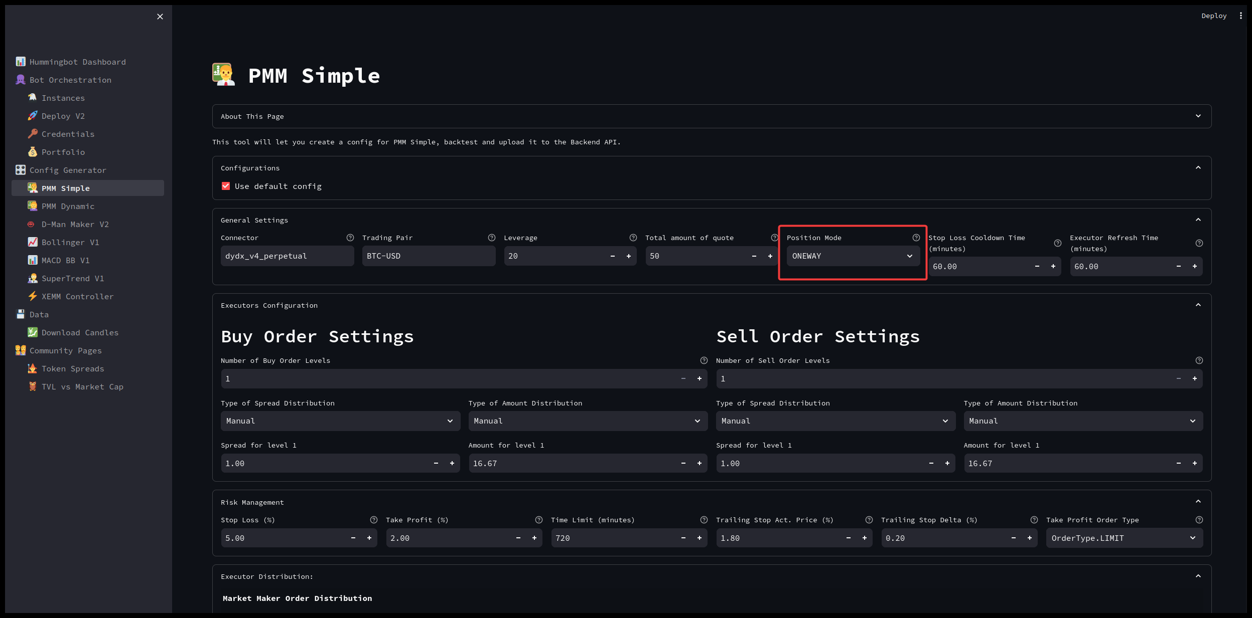 For more details on V2 Strategies or other available controllers, check out the Controllers section of V2 Strategies documentation. Please note that since dYdX only supports one-way mode some V2 Strategies that use Hedge mode may not work correctly with the controller.