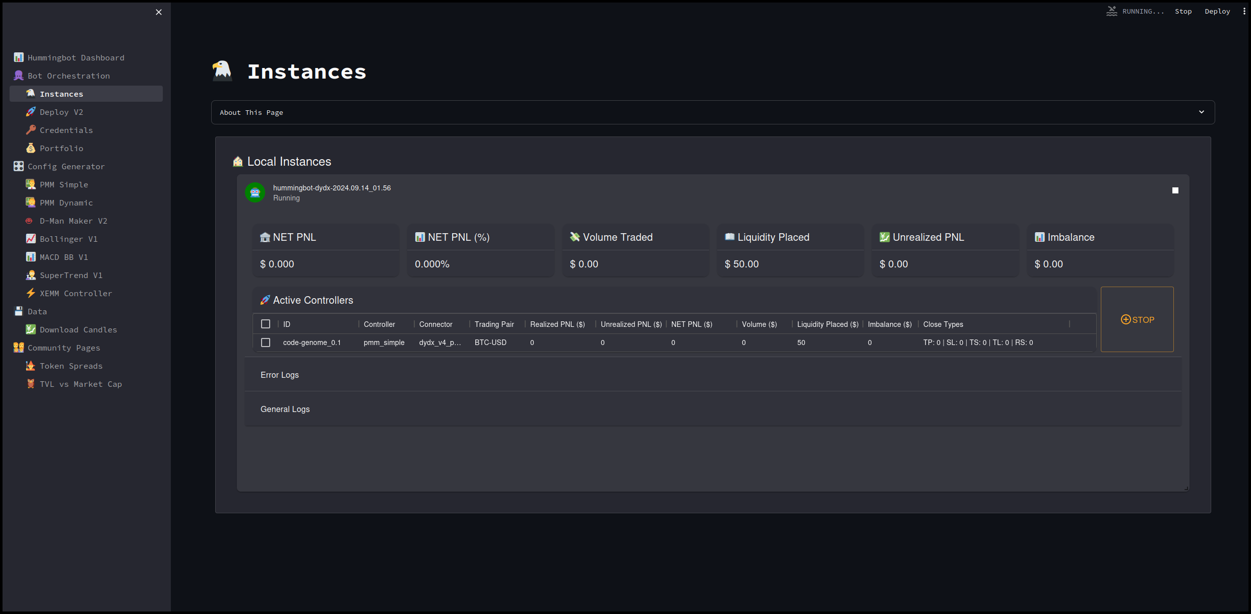 Note: The instance name will include hummingbot + the current date and time. This name appears in the top-left corner under Local Instances. If you need to manually attach to the Docker container, use this complete name to identify the bot instance.