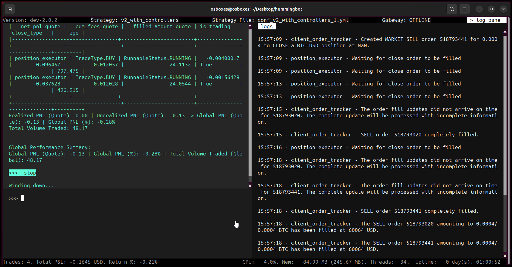 To stop the bot, use the stop command. Please note that the bot will need some time to create orders to close out the positions.