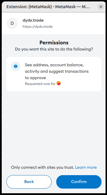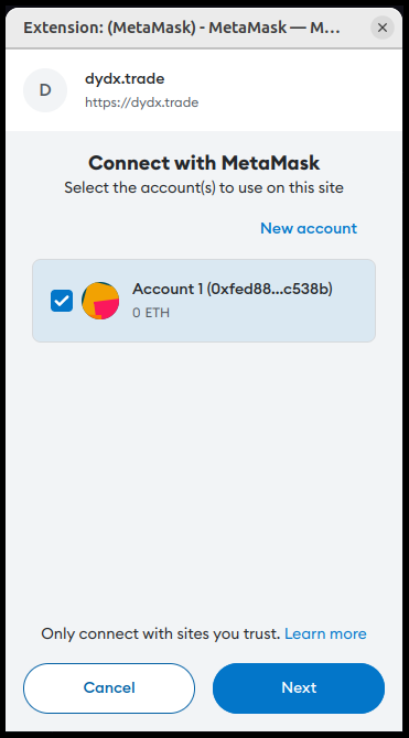 Note: dYdX supports multiple wallets, but for this guide, we'll use MetaMask, one of the most popular Ethereum wallets. MetaMask allows users to interact with dYdX via its browser extension or mobile app.