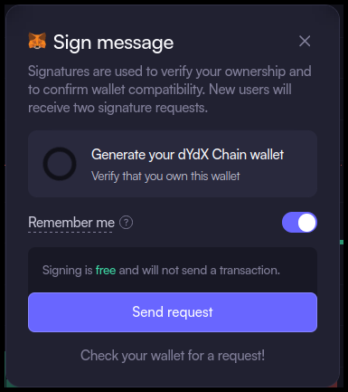 After the wallet is connected, dYdX will prompt you to sign a message to generate the dYdX Chain Wallet.