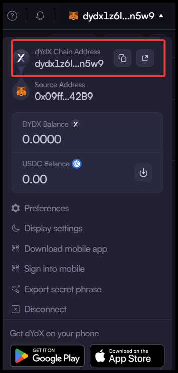 After connecting, locate your dYdX Chain Address in the wallet connection settings. Copy this address and store it securely for future reference.