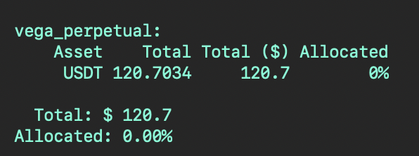 To confirm the connection, run the balance command. Your asset balances should match the amount that you deposited into Vega.