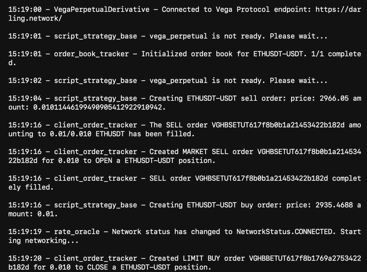 In the logs above, note that the bot connects to the Vega Protocol endpoint https://darling.network. This is the Vega Data Node that streams market data to Hummingbot.