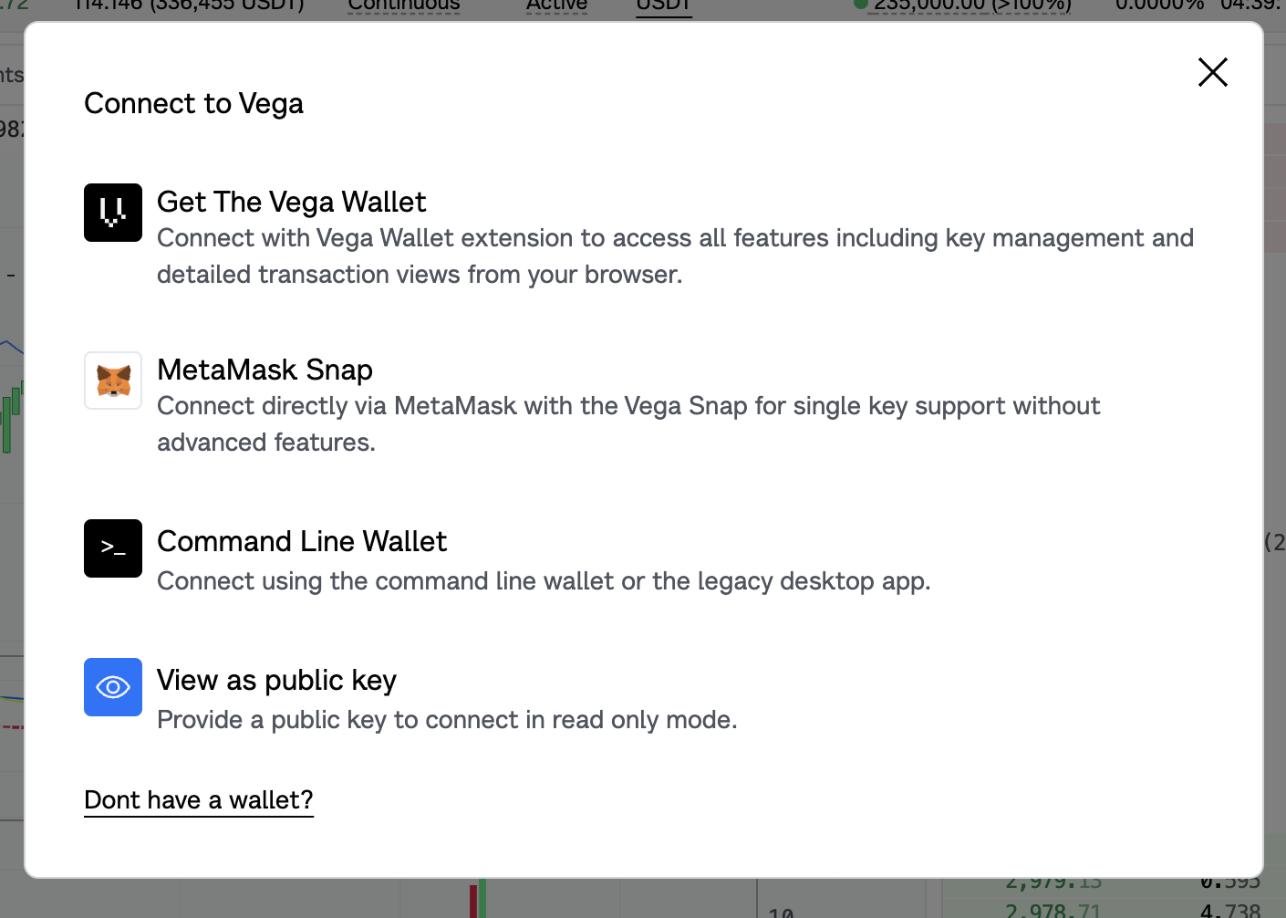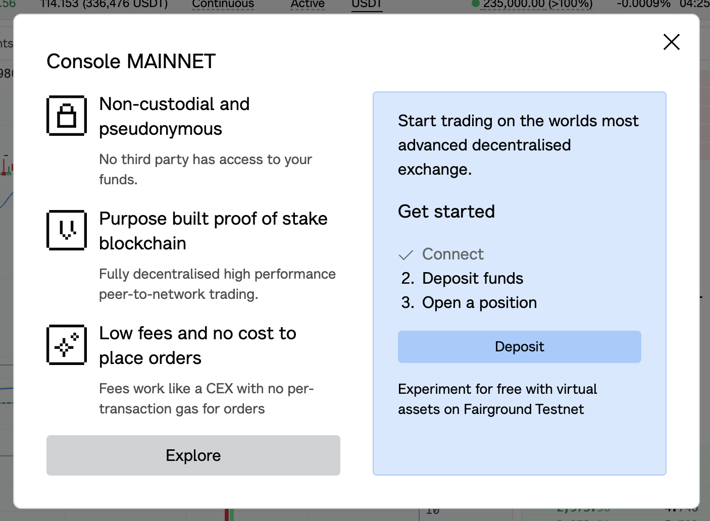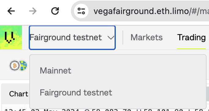 If you want to change to Fairground TESTNET, exit out of the pop-up and click the upper-left hand corner of the Vega exchange website to change the network.