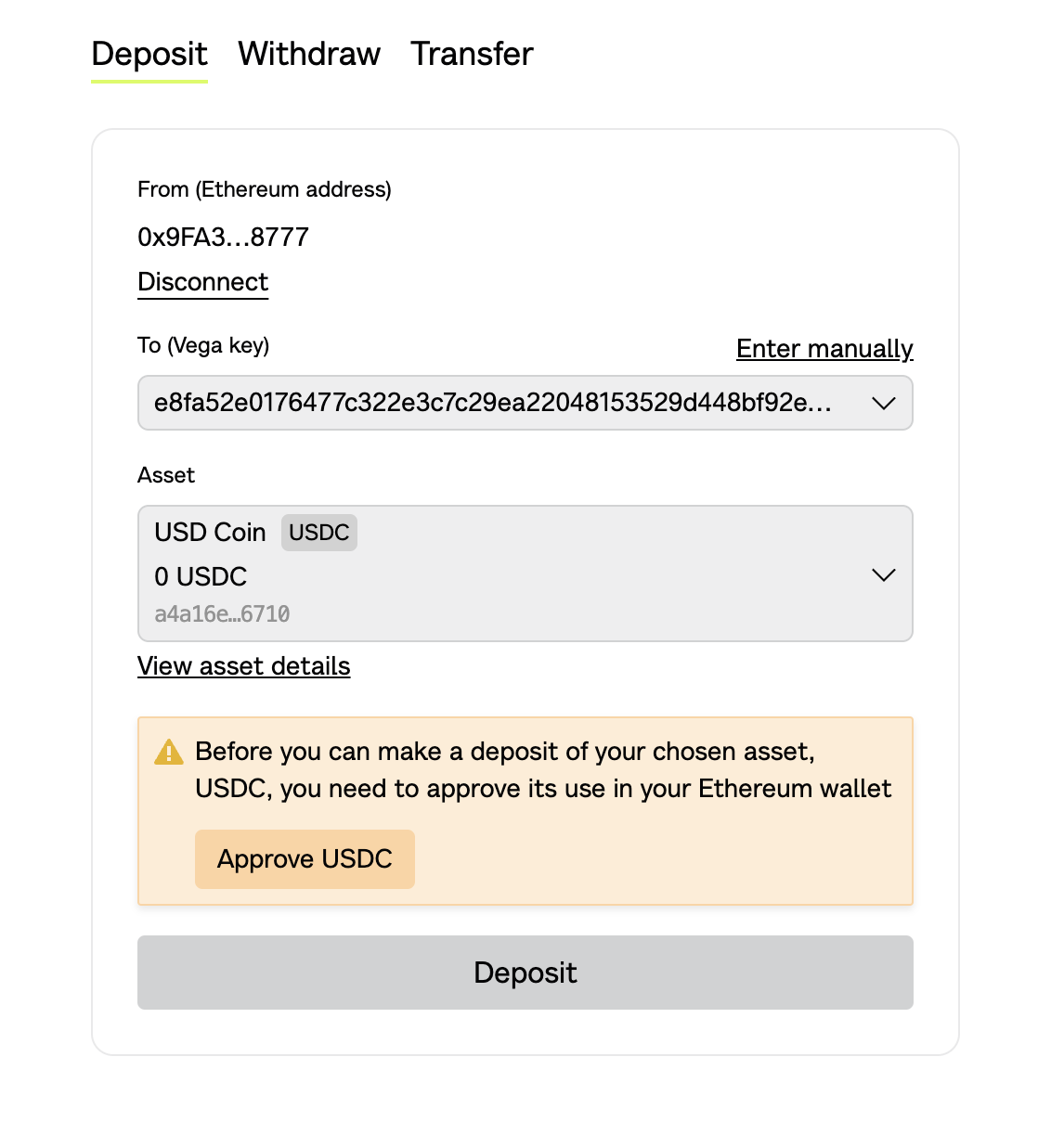Once you have selected your network, click the Deposit button in the pop-up above and connect your Ethereum wallet to approve and deposit eligible tokens to your new Vega wallet.