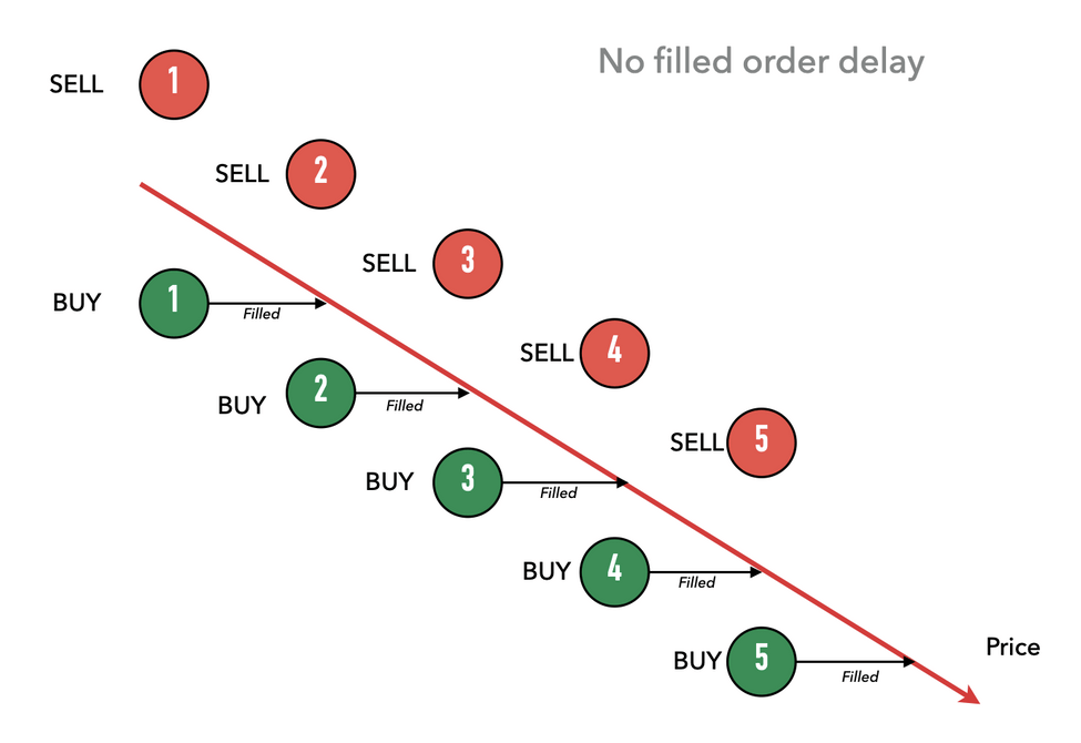 For example, with a filled_order_delay = 300 when an order created by the bot is filled, the next pair of orders will only be created 300 seconds later.