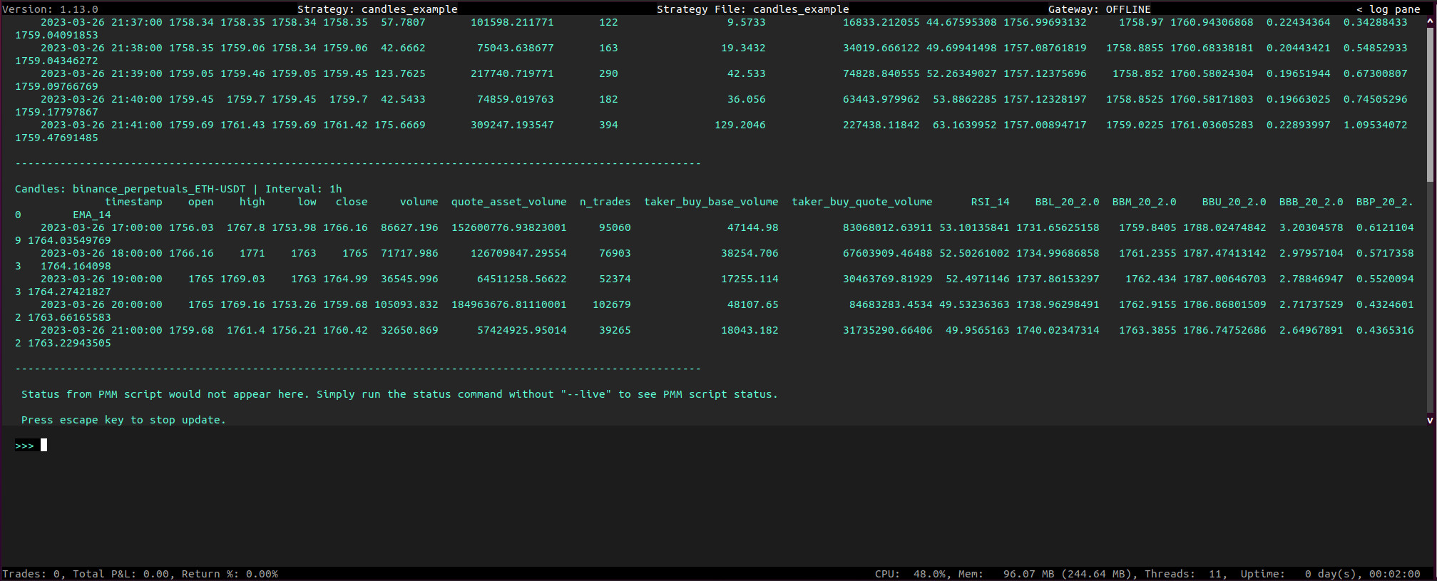startandstopMethods: Control the initiation and termination of the candle data stream.is_readyProperty: Check if the candle data is complete and ready for use.candles_dfProperty: Access the DataFrame containing the latest candle data.