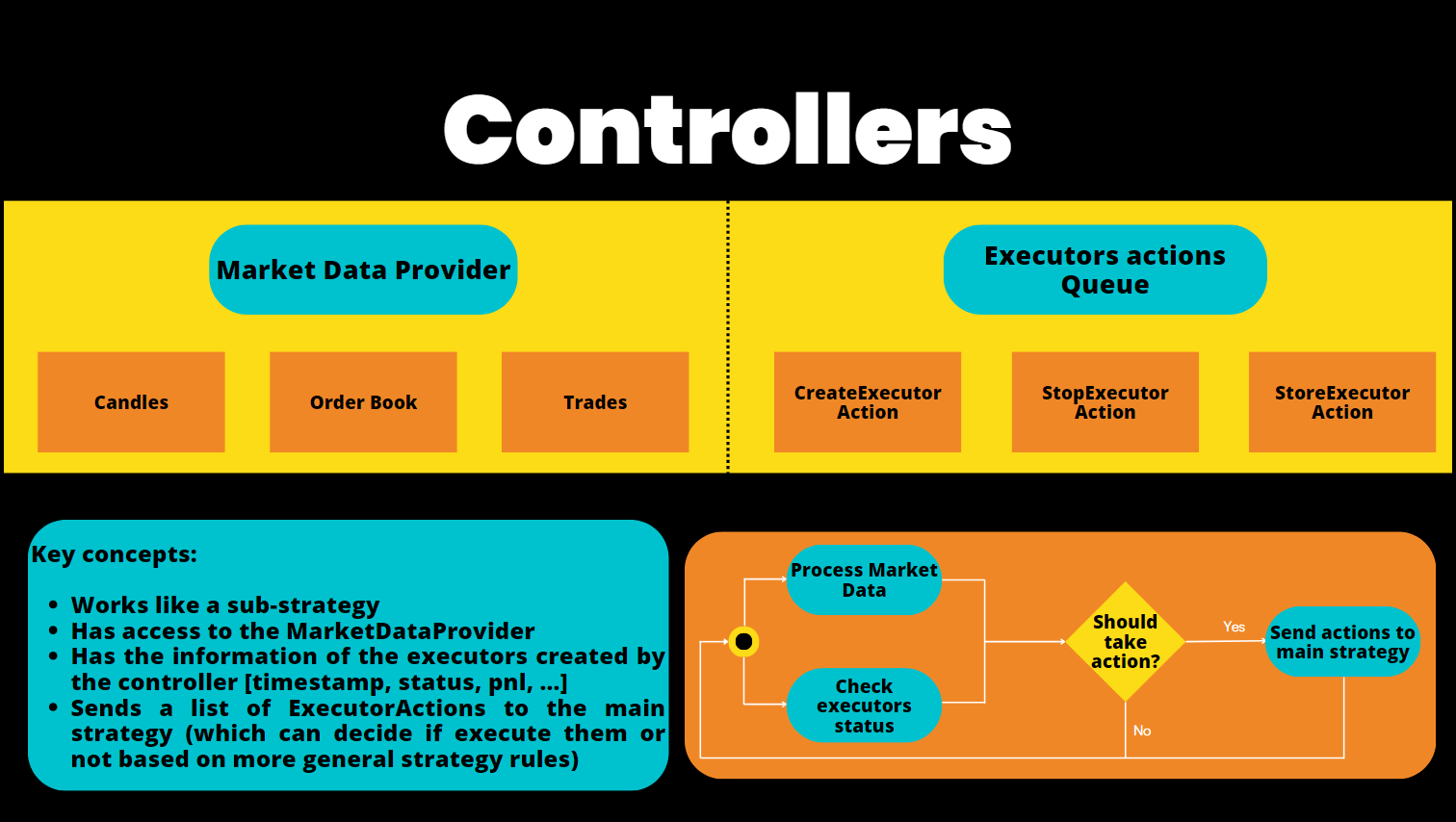 Controllers are the production-grade building block of the Strategy V2 framework. They define reusable, modular sub-strategies that are more configurable and robust than standalone scripts — ideal for long-running deployments and multi-strategy setups.